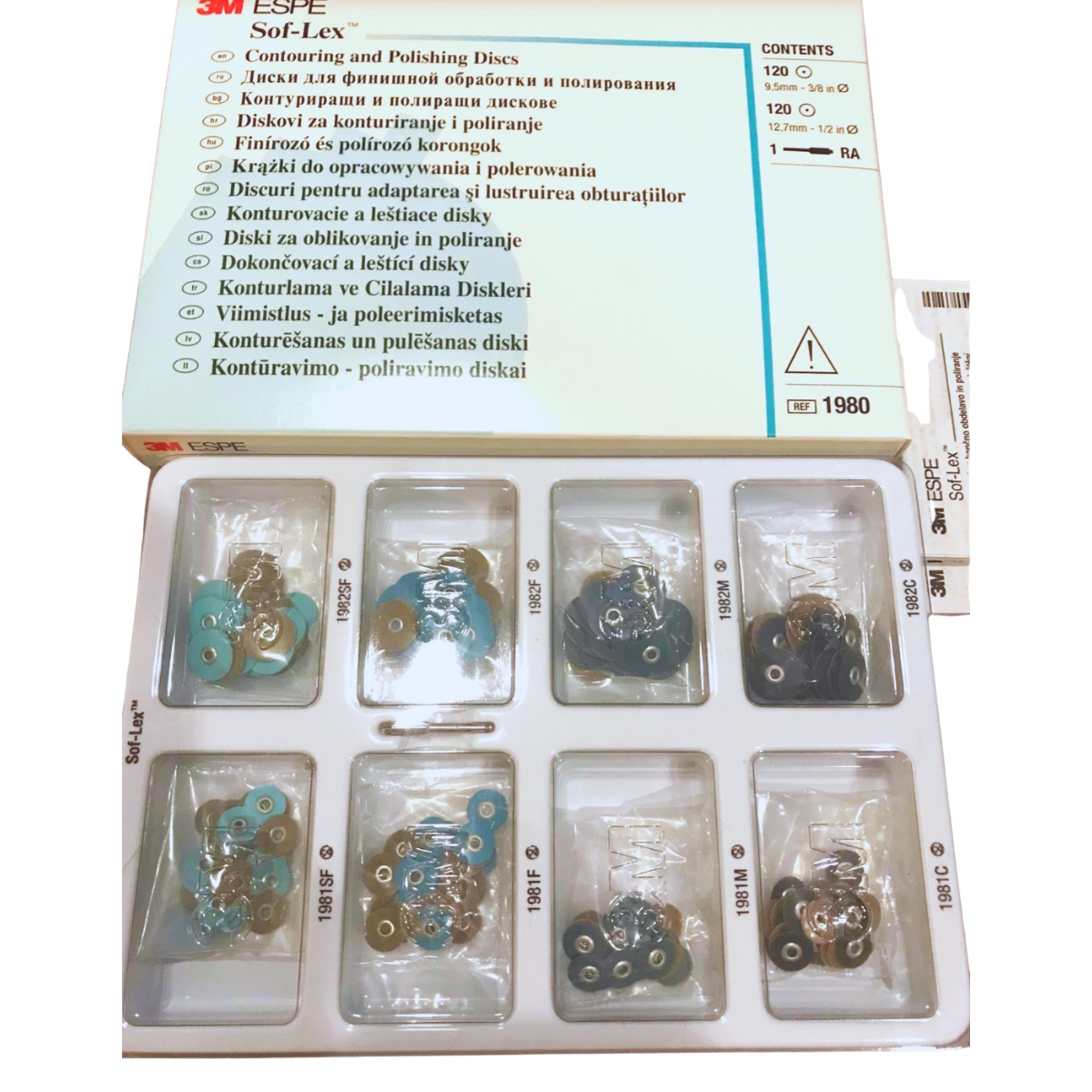 Produces excellent surface smoothness and visual gloss, for more natural looking restorations. Patented flexible backing allows disc to conform to contours of teeth. Contains:30 each 3/8 and 1/2 coarse, medium, fine and superfine discs and 1-RA Mandrel.